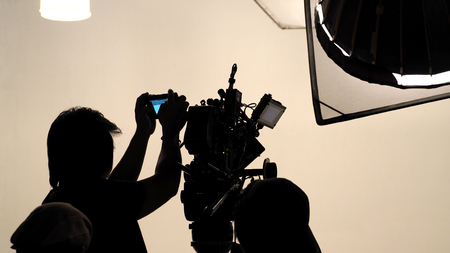 Video production behind the scenes. Making of TV commercial movie that film crew team lightman and cameraman working together with film director in studio. film production concept. Silhouette style.