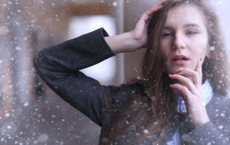 beautiful woman with a revolver in her hands and a glass behind a wet glass with raindrops