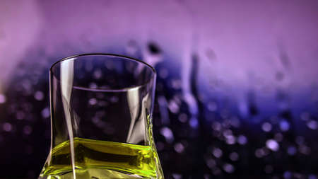 A glass of whiskey close-up, whiskey in a glass on a colorful background.