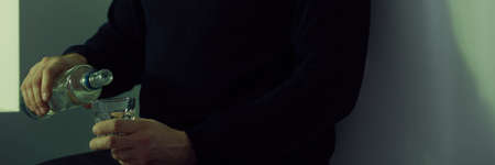 Entertainment for rich people. Unhealthy life. Alcohol and vape advertising, unrecognizable male, bad habits lifestyle. Expensive drinks in focus on foreground closeup