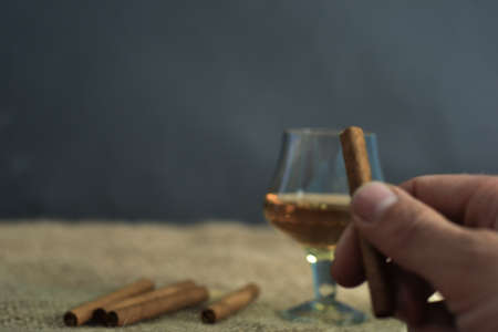 Beautiful background of a table with wood on it cigars, coffee, cognac.