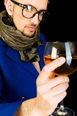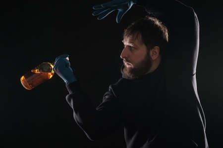 the theater actor plays with a bottle of alcohol, gloves on his hands. art and alcohol