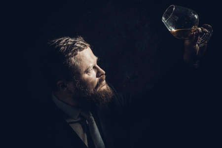 Bearded man in modern coat and shirt smoking his cigar and drink some strong liquor pointing with finger.