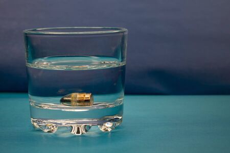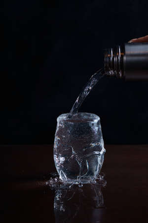 Vodka poured into a glass lit with blue backlight. Copy space.Chilled vodka with pieces of ice.
