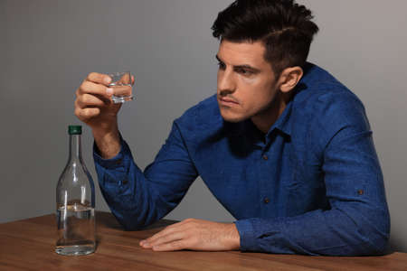 A handsome guy wearing a loose red hoodie with a big transparent bottle full of light alcoholic drink on a saturated black background. A desperate, lonely male with whiskey, beer or scotch in hands.