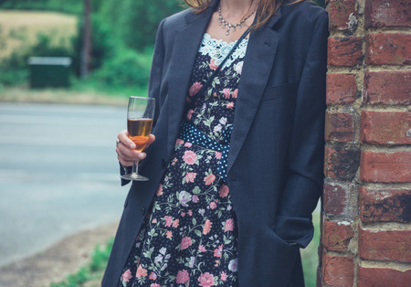A young woman wearing a man's jacket over her dress is standing with a drink by a wall in the countryside