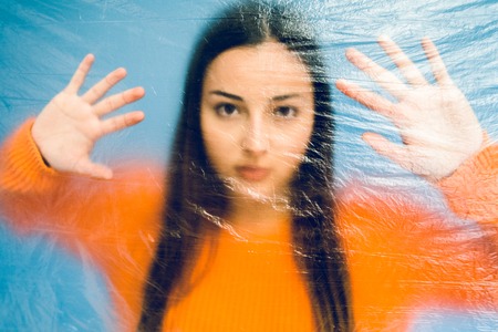 Portrait of teenage girl trapped behind the plastic nylon foil, human rights antipollution trafficking concept
