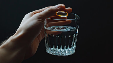 A person holding a glass of water and a single fish oil capsule, ready to consume