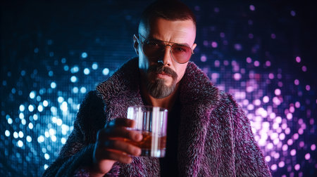 Man looking at camera holds a glass with dark drink. Colorful lights illuminated night setting. Concept of nightlife, party atmosphere, entertainment industry.