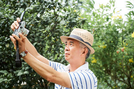 Asian senior man holding digital camera in front of his face and making selfie portrait near the beautiful green trees in summer day outdoors