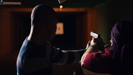 Shooting gallery staff member teaching student how to hold and handle handgun. Firing range expert providing guide to african american woman learning how to achieve proficiency with guns, camera B