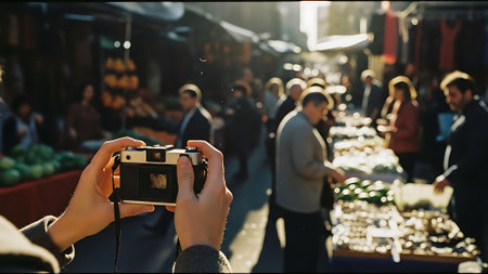 A close-up of hands gripping a vintage camera, set against an urban background at dusk, highlighting the passion for photography and the art of capturing moments.