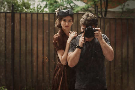 Lifestyle portrait of young photographer with vintage camera taking photo.