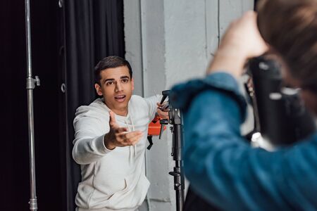 selective focus of handsome assistant gesturing while talking near man in photo studio