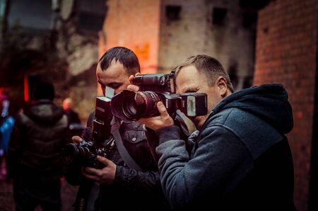 Blonde pretty photographer woman with retro camera in her hands while taking pictures at urban old architecture. Discover new places.
