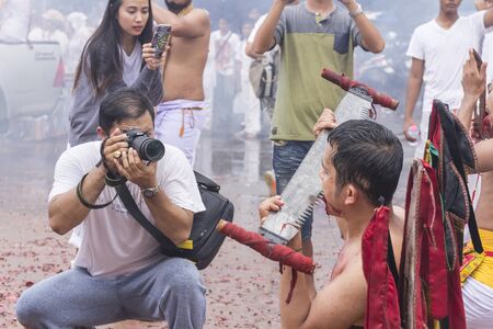 KRABI, THAILAND - OCTOBER 4: Taoist devotees participate at street procession of Krabi vegetarian festival on October 4, 2016 in Ktabi, Thailand.