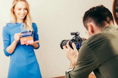 Backstage of professional studio photo session . Unrecognizable man taking shot of female model, and assistant helps him. Photo school, lookbook, fashion blogger concept