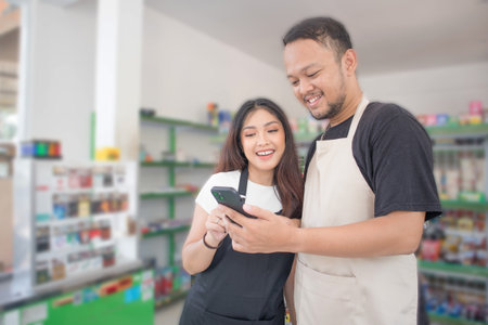 couple Confident young Asian people as convenience store or modern market staff in apron standing with pointing the phone while standing in front of display shelf.