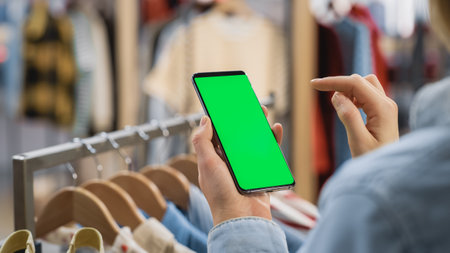 Clothing Store: Female Using Smartphone with Chroma Key Green Screen Display. Clothes Hanger with Stylish Branded Items for Retail Sale In the