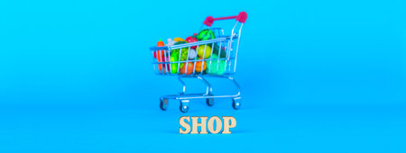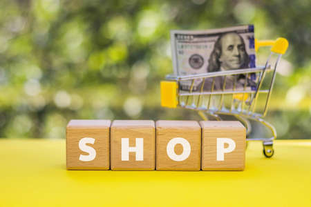 Wood cubes with text SHOP and mini shopping cart with 100 dollars, natural green blurred background. Business, finance, online store, money saving concept. American currency.