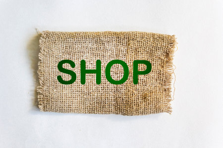 Shopping bag with sale tag and blue speech bubble with white Shop text. Ideal for online shopping promotion retail sales discounts ecommerce advertising and store marketing. Minimalist vector style