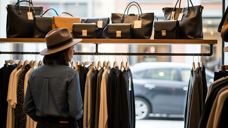 Woman shopping in a clothing store. Rear view of a young woman wearing a hat and looking at a black leather bag.