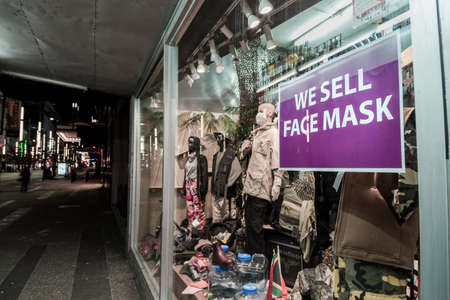 DOWNTOWN VANCOUVER, BC, CANADA - APR 05, 2020: A store front on Granville street selling highly sought after medical face masks amid the Covid 19 pandemic.