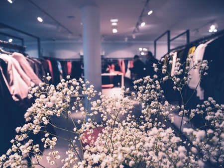 Warm tones defocused view of luxury fashion clothes store seen through plants with customers searching for clothes in the background