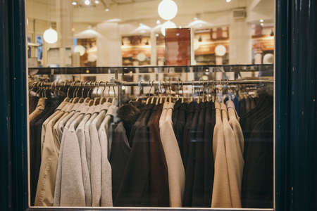 blurred background - men's clothing store. hangers for shirts, jackets, trousers, stylish shopping.