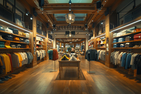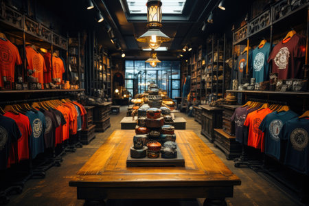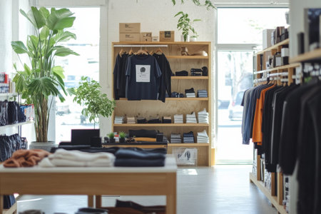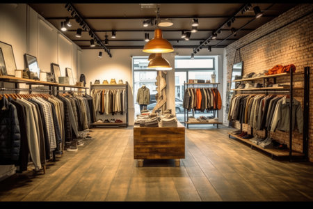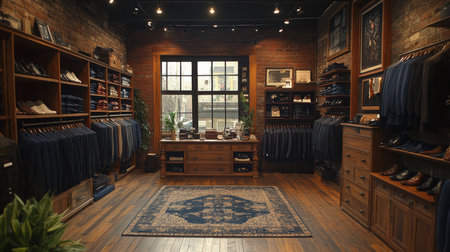 Cozy clothing store interior featuring wooden furniture and a stylish display in a boutique atmosphere Generative AI