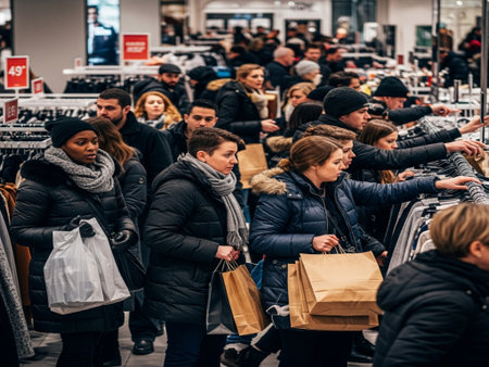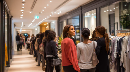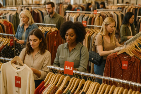 Diverse customers browsing through stylish clothes on hangers, examining vibrant sale tags in a trendy fashion boutique