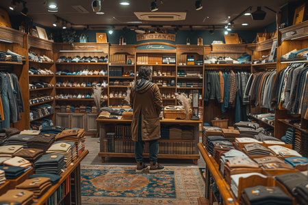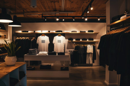 cozy, well-lit clothing store with neatly arranged apparel, shelves, and warm ambient lighting