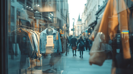 A bustling street captures the reflection of a clothing store near pedestrians walking by in daylight.