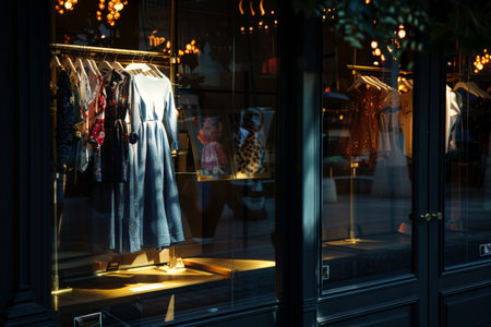 Cozy boutique storefront with a warm lighting, vintage-inspired fashion, and stylish mannequins.