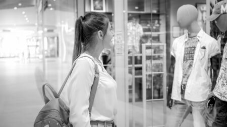 Black and white portrait of beautiful smiling woman choosing new clothes in shopping mall