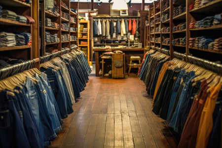 A trendy clothing store featuring hanging jeans and jackets, styled with warm lighting and modern interior decor elements.
