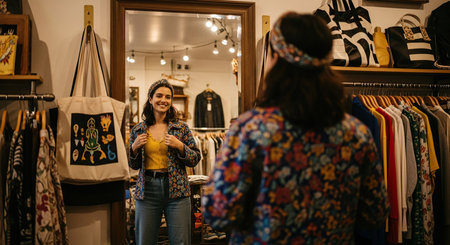 A cozy boutique scene featuring a woman in a yellow hoodie and beanie exploring stylish clothing options. Ideal for lifestyle and fashion themes.
