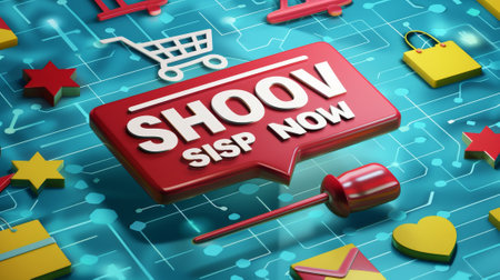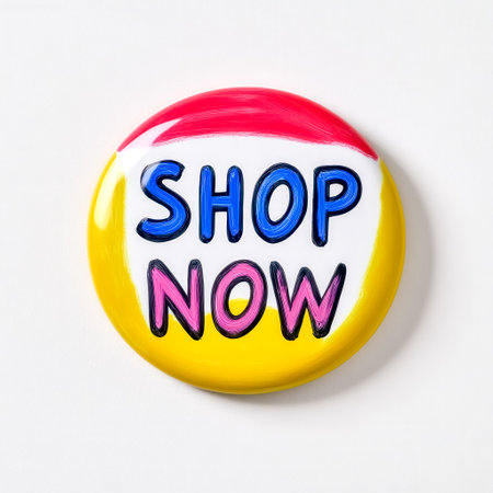 Colorful button showing shop now urging consumers to buy