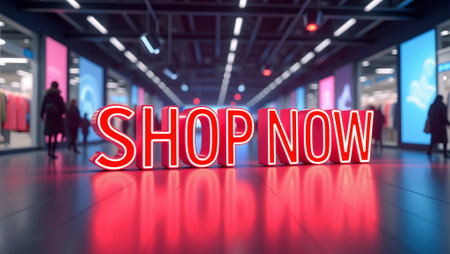 Futuristic SHOP NOW signage in glossy 3D letters with digital light trails in hightech mall interior