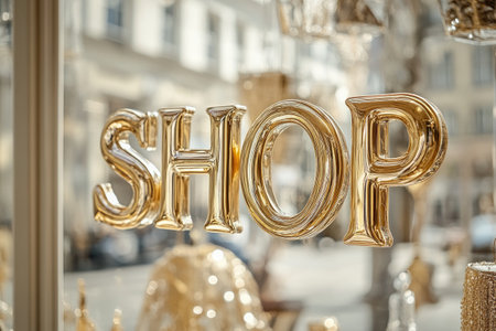 Golden shop sign hanging on a glass window inviting customers to enter and purchase
