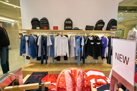 HONG KONG, CHINA - JANUARY 23, 2019: clothes on display at Calvin Klein Jeans store in New Town Plaza. New Town Plaza is a shopping mall in the town centre of Sha Tin, Hong Kong.