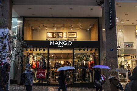 Athens, Greece - January 4, 2019: Display of a Mango store at night with people around in Athens, Greece