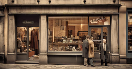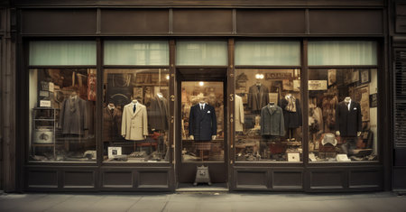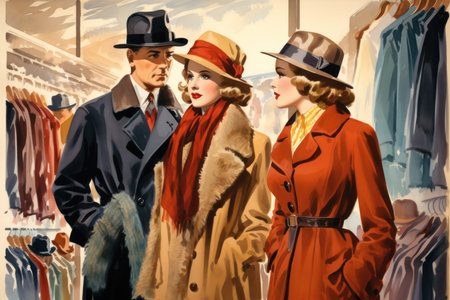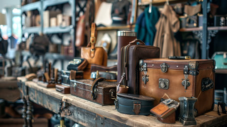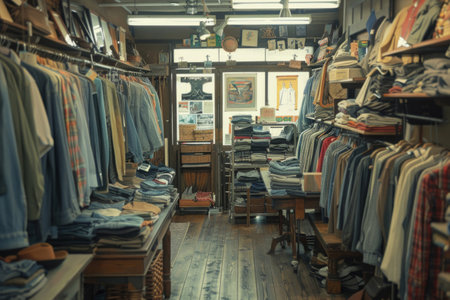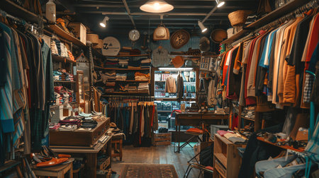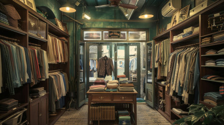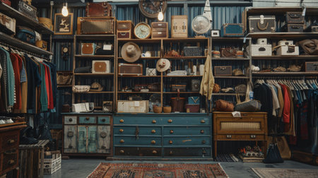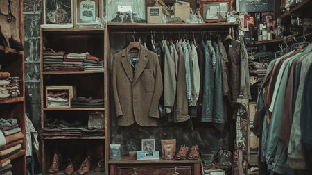 A collection of vintage clothing and accessories neatly displayed in a classic shop setting. The nostalgic and well-organized scene is perfect for fashion, retail, and vintage style themes.