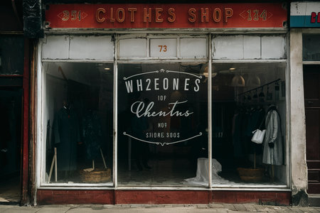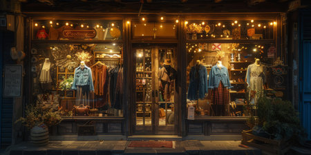 Cozy boutique storefront with a warm lighting, vintage-inspired fashion, and stylish mannequins.
