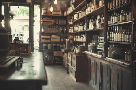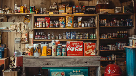 A nostalgic scene of a vintage general store with wooden shelves filled with retro packaging and products, capturing a charming rustic atmosphere.