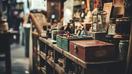 Vintage market stall filled with an assortment of products, including packaging, books, and crafts, evoking a nostalgic and charming atmosphere.