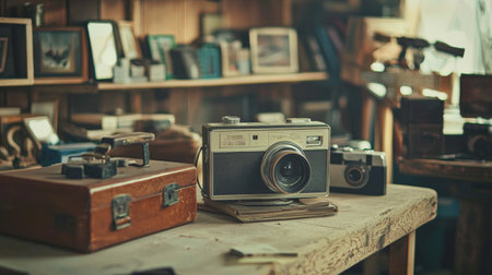 A close-up of vintage cameras displayed on a rustic wooden desk, surrounded by retro objects and soft lighting, evoking nostalgia and history.
