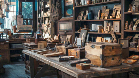 An inviting antique shop featuring rustic wooden furniture and vintage collectibles. Shelves filled with old treasures create a nostalgic and charming ambiance.