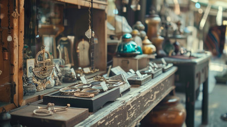 An antique market showcasing a variety of vintage items on display, reflecting history and charm through unique collectibles.