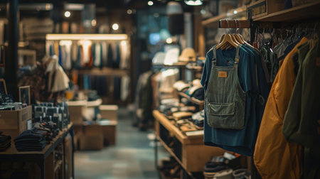 A trendy clothing store featuring hanging jeans and jackets, styled with warm lighting and modern interior decor elements.